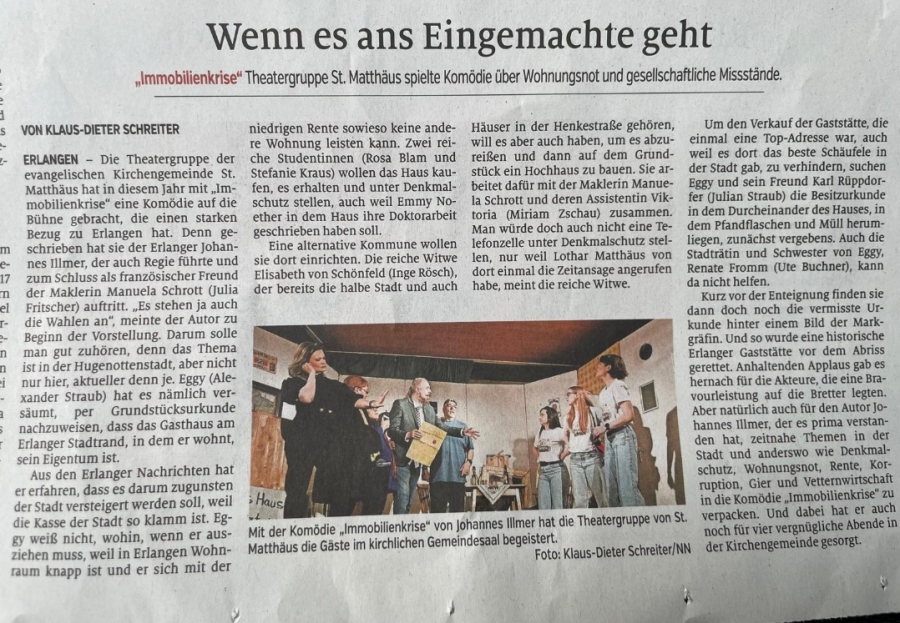 Die Immobilienkrise ist auch überall zu spüren und unser Johannes hat daraus ein Theaterstück entworfen, mit vielen vielen Quadratmetern Humor und natürlich auch vielen raumhohen Fenstern Richtung feiner Ironie und bestimmt auch wunderbare Sanierungstipps in Sachen Geldbeutel für die Bauherren (unserer Stadt?).